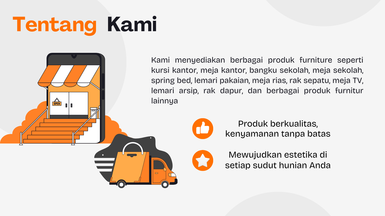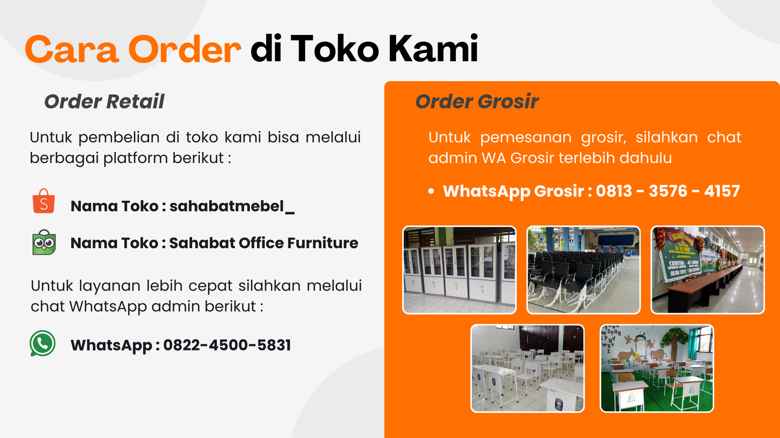 Kami melayani pemesanan kursi kantor, meja kantor, lemari arsip, meja kuliah, kursi kuliah, meja sekolah, kursi sekolah, serta furnitur modern lainnya yang berkualitas